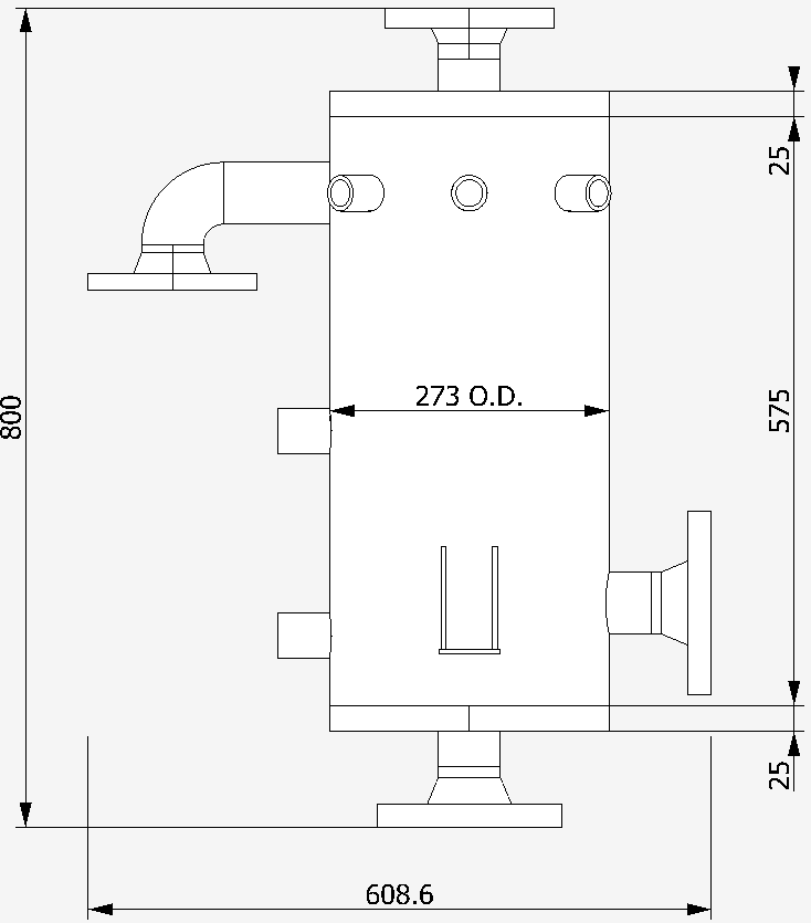 This design combines different geometries such as elliptical heads, straight shells, and conical shells. It has multiple inlets and outlets with different angles and flanges that can be connected to a variety of systems.